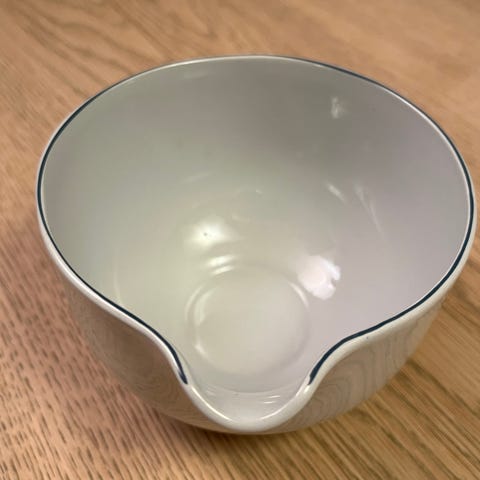 Det er en tidløs klassiker som er kendetegnet ved sin simple form og den karakteristiske mørkeblå stribe langs kanten, som gav stellet dets navn.