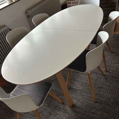 Bordplade hvid laminat, kant i hvidolieret eg og ben i hvidolieret eg. 130cm i diameter