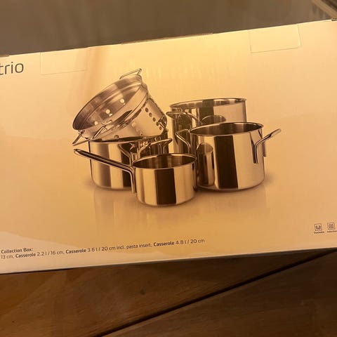 Sælger dette fine grydesæt fra Eva Trio som jeg har fået i julegave 2024, aldrig brugt og er stadig i kassen med plastik omkring gryderne.