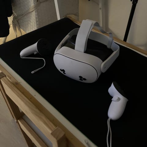 Meta Quest 3 VR-headset i hvid farve. Inkluderer headset og tilbehør, designet til virtuel reality oplevelser.