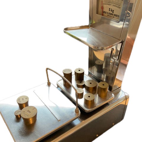 Vægten har det karakteristiske buede glas og tydelig skala med tekst. Et ægte stykke dansk industrihistorie.
