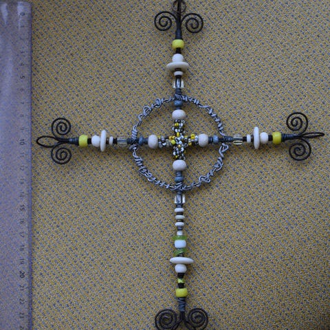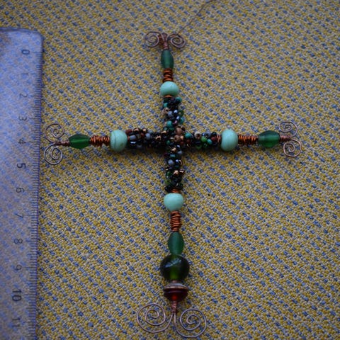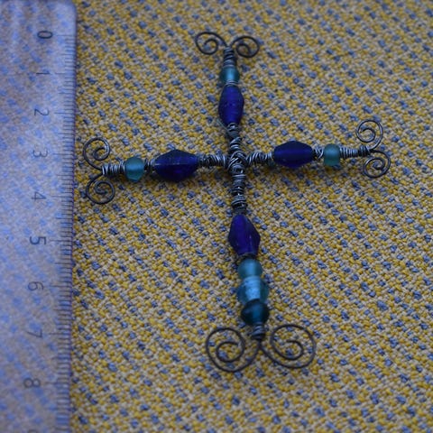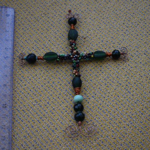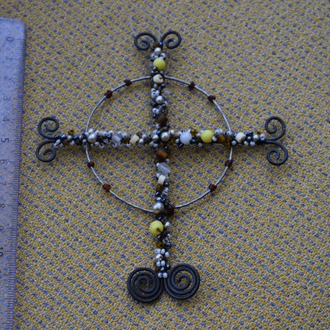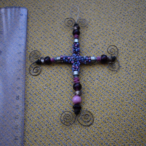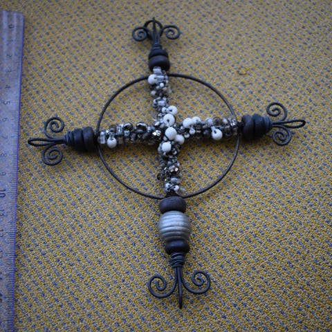 Fint lille kors lavet af metal og perler. Størrelsen kan ses på foto.