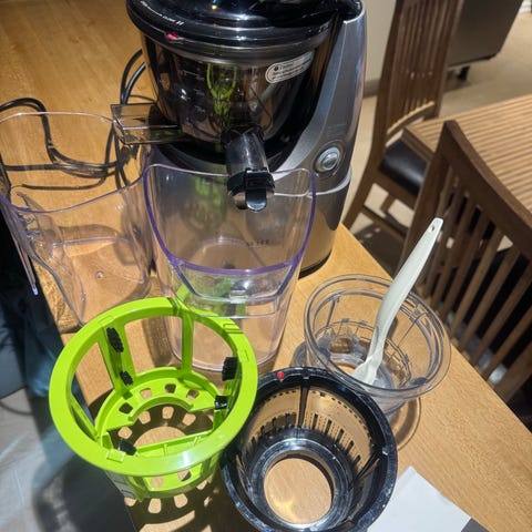 Witt Slow Juicer i grå farve. Medfølgende dele til juicepresning og frugtpresning. Designet til langsom presning for at bevare næringsstoffer i juice.