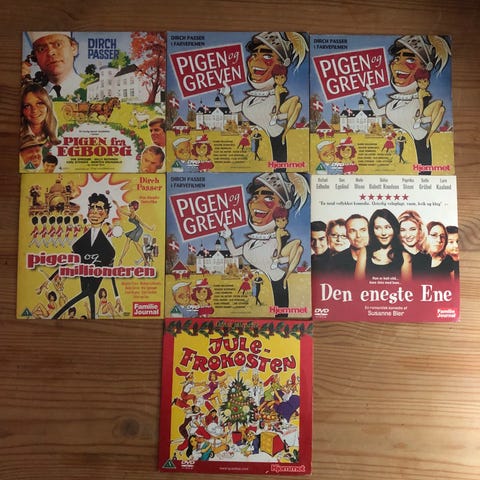 36 film med Dirch passer og hele Olsen Banden og en dvd med en pige og 39 sømænd