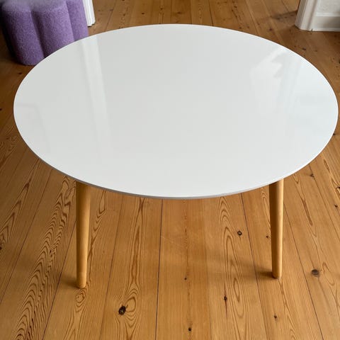 • Hvid bordplade og ben i træ-look, passer ind i de fleste hjem.