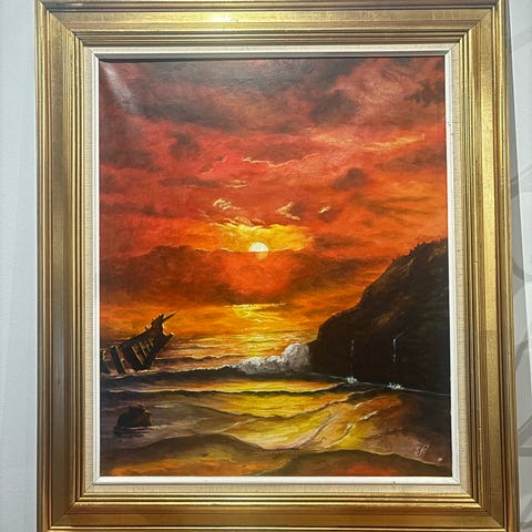 Olie maleri der viser en solnedgang over havet med bjerge i baggrunden. Maleriet er indrammet i en gylden ramme og indeholder varme farver som orange, gul og mørke nuancer. Signeret af kunstneren nederst i højre hjørne.