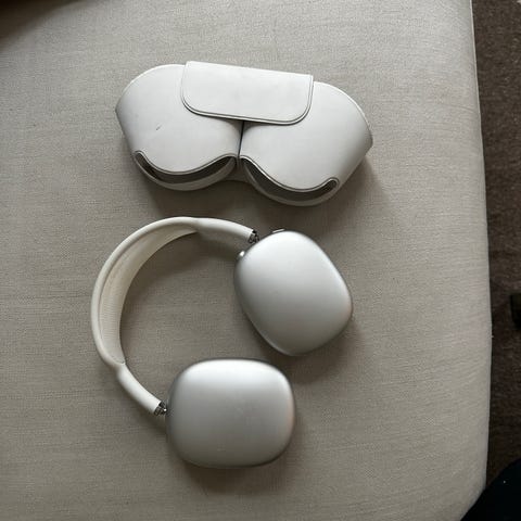 Apple AirPods Max hovedtelefoner i sølvfarve med over-ear design. Hovedtelefonerne har aktiv støjreduktion og trådløs forbindelse. De er kompatible med iOS-enheder og andre Apple-produkter. Leveres med et smart cover til opbevaring.