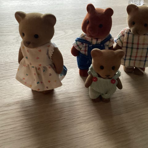 Sylvanian Families figurer sæt bestående af flere små dyr i forskellige designs og tøj. Figurerne inkluderer blandt andet kaniner, bjørne, en elefant og en pindsvin. Fremstillet af blødt materiale og egnet som legetøj for børn.