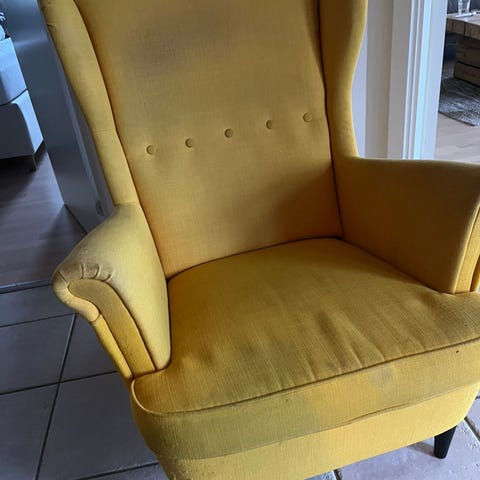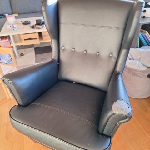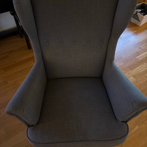 Grå Strandmon lænestol inkl puf sælges grundet plads mangel.