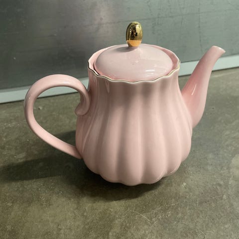 Sæt bestående af en tekande og kop i keramik i et fælles design. Tekanden er dekoreret med et mønster af farverige hjerter, mens koppen har et stribet design. Velegnet til at tilberede og nyde te.