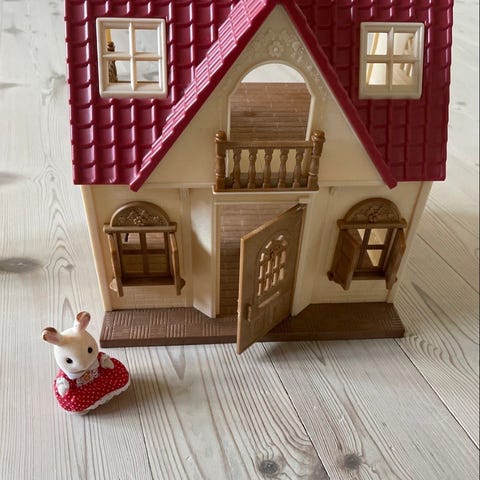 Sylvanian Families dukkehus med tilhørende møbler. Huset har to etager med trappe, køkkenudstyr, badekar og skabe. Materialet er plast og træ, og det er designet til børn.