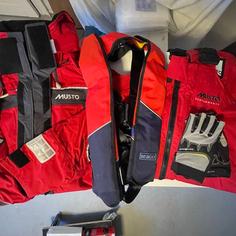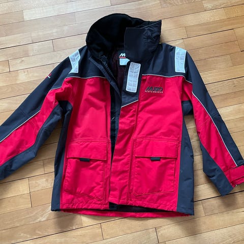 Musto BR1 sejlerjakke og bukser i blå og grå farver. Jakken har lynlåslukning og lommer, og bukserne har justerbare stropper og lommer samt en smart “bagklap” til toiletbesøg. Stort set ikke brugt. Nypris 3000 kr. Jakke er UK 10 (cirka EU 38-40). Bukser er UK 8 (cirka EU 36-38).