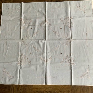 Fin lille håndbroderet dug og to stk dækkeservietter med broderede kanter