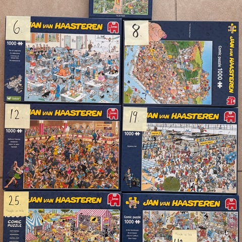 Jeg har 10 puslespil a 1000 brikker fra Jan van Haasteten. The Airshow, the craft brewery, world Championships cyrotoss, get well soon, the building site, almost ready, technical highlight, new year Party, the dog show, the film set, sports day, golf. Alle bare lagt een gang. 75, kr pr stk 3 for 200