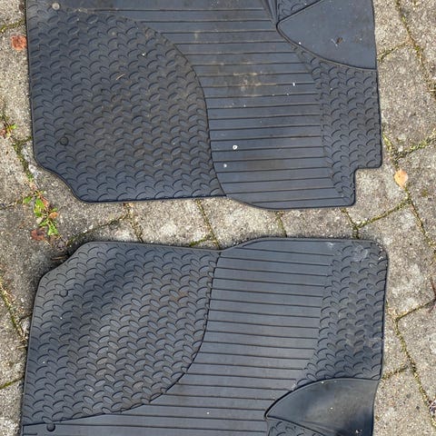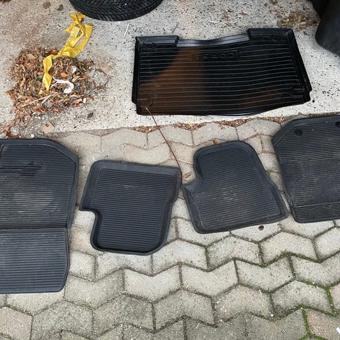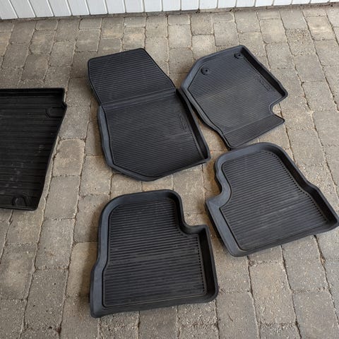 Opel Corsa gummimåtter sæt bestående af fire dele. Måtterne er sorte og designet til at passe specifikt til Opel Corsa modeller. De har riller for bedre vand- og snavsbeskyttelse og inkluderer fastgørelsespunkter for korrekt placering i bilen.