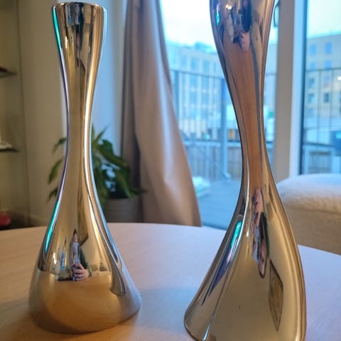 Georg Jensen lysestager i sølv med et moderne og organisk design. Lysestagerne har en rund og bølget form, der giver et unikt udtryk. Fremstillet i sølv, velegnet til dekoration og brug med almindelige stearinlys.