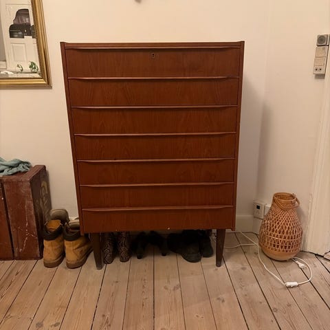 Jeg sælger den store teakommode grundet flytning. Den er bred - omkring 2 meter, så der er god plads til masser af opbevaring.