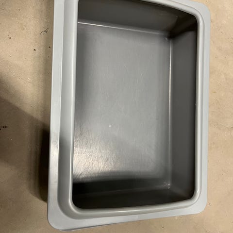 Velholdt kattebakke med flip låg, et ubrugt filter og skoven. Der medfølge grå kattemåtte (44x55) der samler grus og en uåbnet kattebakke rulle poser.