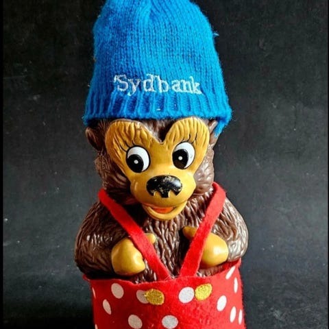 Sydbank bamse sparebøsse med blå hue og røde bukser