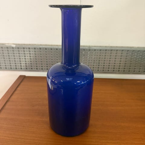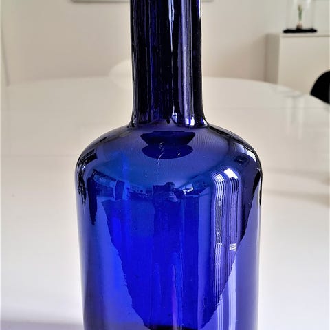 Flot blå bordflaske, 25cm høj. I fin stand dog et "prik" på halsen. ingen vandpest & ingen aflejringer i flasken.