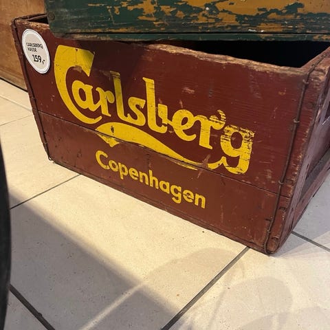 Carlsberg trækasse med Carlsberg logo og teksten "Copen: Brygen". Kassen er lavet af træ og har en rustik, vintage stil. Den kan bruges til opbevaring eller som dekorativt element.