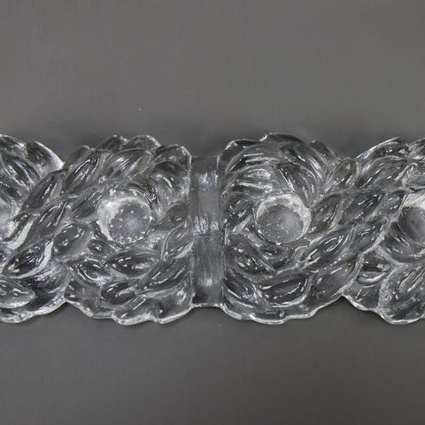 Fra svenske Orrefors Glasbruk. Tung stage til fyrfadslys eller måske et smalt bloklys. Tung og buttet med irregulære, afrundede takker. Ø13 cm. Du kan loppesjoppe den for 125 kr.