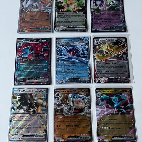 Pokémon Exeggutor samlekort opbevaret i en metalæske med Pokémon-tema. Indeholder flere kort med forskellige Pokémon-figurer og angrebsværdier. Metalæsken har et farverigt design med Pokémon-motiv.