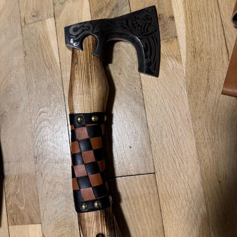 Viking økse med dobbeltbladet hoved og træskaft, dekoreret med vikingemotiver. Kniv sæt bestående af tre knive med skaft i forskellige materialer og læderskeder. Knivene har metalbeslag og er designet til praktisk brug med beskyttende læderskeder.