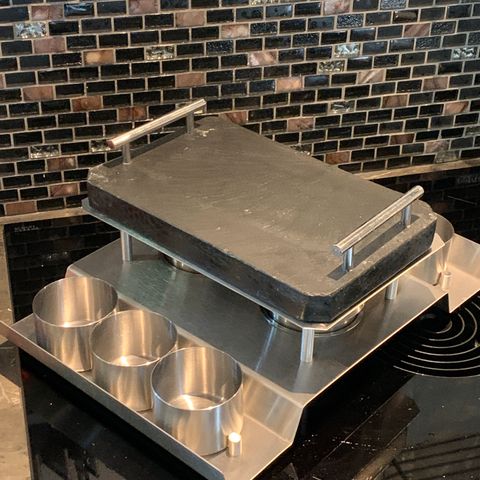Fondue i støbejern med bøgetræplade
