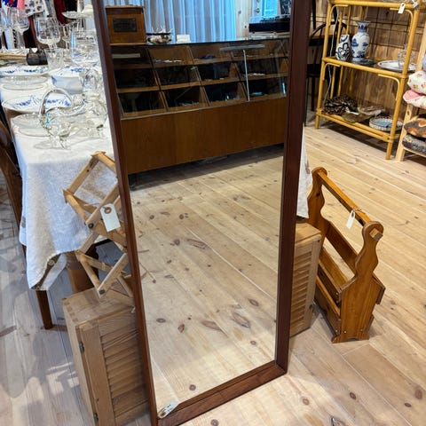 Sælger dette fine, tids løse, rektangulære spejl med en bred, ramme i massivt teaktræ. Spejlet kan både hænges op eller stå på gulvet som et gulvspejl. Perfekt til entré, soveværelse eller garderobe.