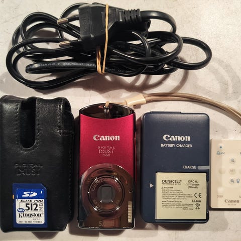 Det sælges med batteri og oplader, kabel til overførsel af billeder, taske samt et SD kort på 12B.