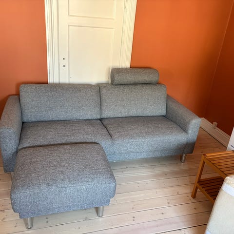 Fin sofa med chaiselong i gråt stof. Puf medfølger. Behagelig at sidde i. Rigtig fin stand, men bemærk at der er en mørkere plet på armlænet(ses på billede 3), man kan dog få træ-bakken(som ses på billedet) med i købet gratis, som kan dække denne.