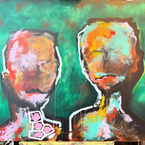 Maleri med abstrakt motiv af et ansigt i flere farver på en orange baggrund. Kunstværket viser en stor hovedfigur og en mindre figur i nederste venstre hjørne. Farverne inkluderer blå, gul, rød og sort, malet med tydelige penselstrøg. Maleriet er lavet af Søren C. Artboogie saksild strand. Leveres med svæveramme fra Bogø design.