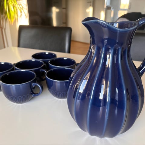 Næsten som ny, brugt 2-3 gange.IKEA kande og kopper i blå keramik. Sættet består af en kande og seks kopper, alle med en bølget overfladestruktur. Kanden har en stor hank og en bred åbning, mens kopperne har hank og en rund form. Velegnet til servering af drikkevarer.