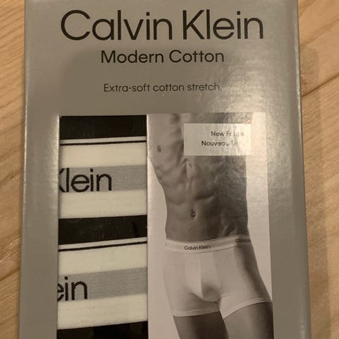 Uåbnet kasse med 3 stks sorte calvin klein boksershorts med hvid kant.