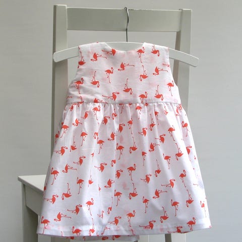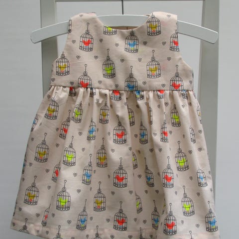 Syet af 100% bomuld i et flot print med tomatrød baggrund og hvide fuglebure med fugle i forskellige farver. Toppen er foret med kjolestoffet, skørtet er et enkelt lag stof. To små trykknapper på hver skulder. Ekskl. bøjle.