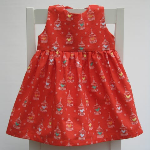 Syet af 100% bomuld i et flot print med pudderrosa baggrund og sorte fuglebure med fugle i forskellige farver. Toppen er foret med kjolestoffet, skørtet er et enkelt lag stof. To små trykknapper på hver skulder. Ekskl. bøjle.