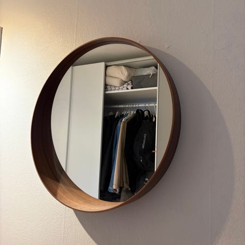 IKEA Stockholm - Ø80 cm - rundt spejl med træramme. Spejlet har en rund form og en ramme lavet af træ, hvilket giver et naturligt og enkelt udseende. Velegnet til vægmontering i forskellige rum som entré, badeværelse eller stue.