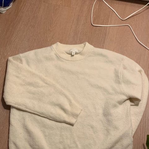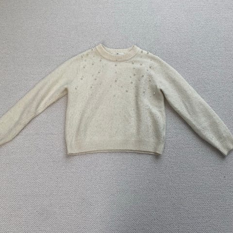 H&M sweater i bomuld i størrelse S til kvinder. Sweateren er hvid og har detaljer som broderede mønstre og flæser. Materialet er 100% bomuld, hvilket gør den behagelig at have på.