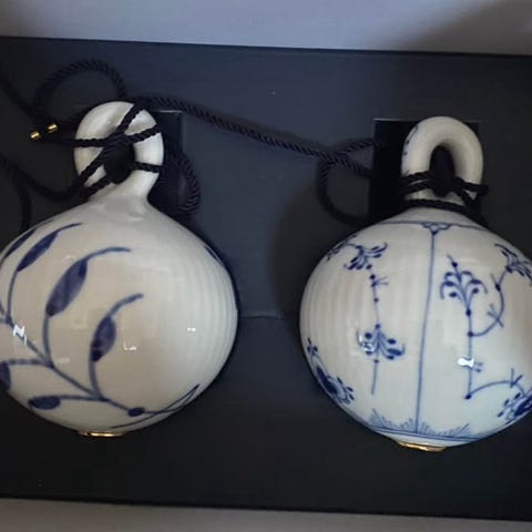 2 smukke julekugler. Hjerte og trompet. Flot stand med originale bånd. 1 æske 490 kr