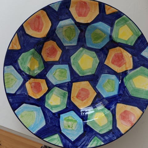 Lille fad/tallerken med et dekorativt mønster i grønne og sorte farver. Fadet har en rund form og er håndlavet. Bunden af fadet er uglaseret.