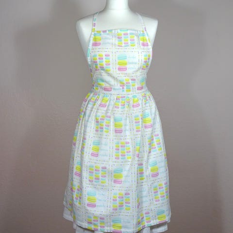 Super sødt forklæde i ren retro-stil med masser af søde detaljer. Flæser overalt og lange bindebånd. Forklædet er lavet i macaron-print med detaljer i turkis-og-hvid prikket. One size.