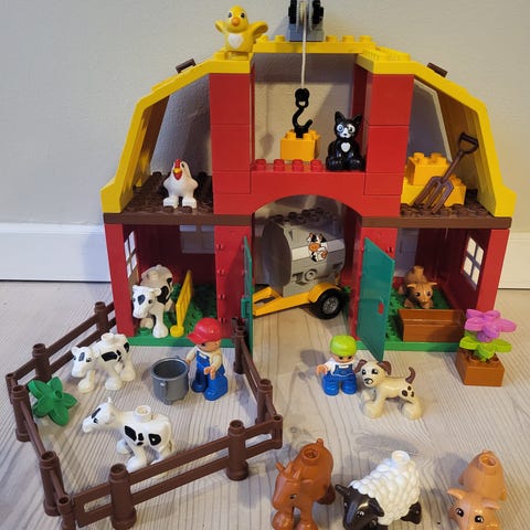 På gårdspladsen er der en indhegning med husdyr: hest, ko, gris og får. Inde i staldene er der et lille lam og en griseunge. Et egern har slået sig ned på den ene stald, og en høne er flakset op på den anden.