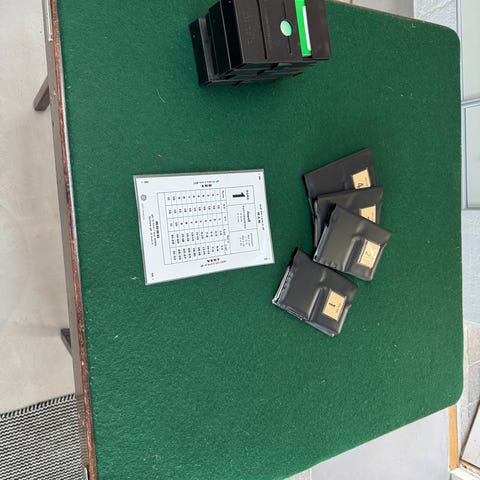 Gammelt Sammenklappeligt bord / Klap sammen bridgebord. Den grønne filt har huller. Filten kan udskiftes.