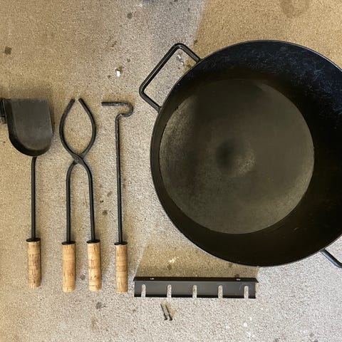 Pejsebrændekurv / - spand i sort metal fra ABC pejse i fin stand. Pejsesæt (ukendt mærke) med kost, rager og skovl følger med i prisen.