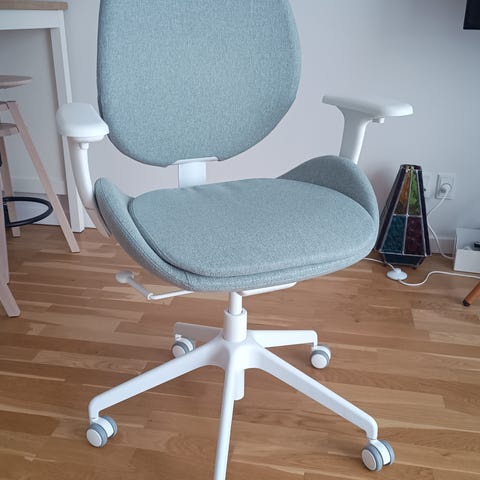 Sælger et kontorstol Hattefjäll fra IKEA i grå og hvid med armlener. Mål her i dba er ca mål omkring sedhøjde, -bredde og -dybe. Exakt mål findes på IKEA hjemmesiden.