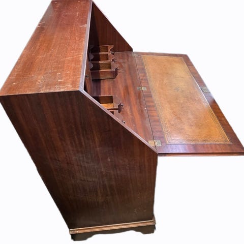 Sæt af vintage træmøbler bestående af en kommode med flere skuffer, et skrivebord med låsbar top og opbevaringsrum, samt mindre skuffemøbler og et bord med dekorativt mønster. Møblerne har forskellige træsorter og finish, egnet til opbevaring og dekoration i hjemmet.