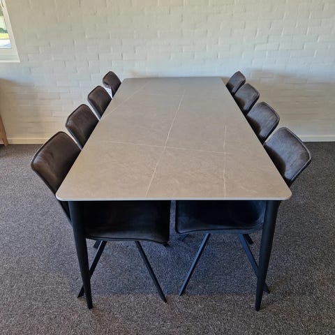 Spisebord med keramik bordplade, uden synlige brugsspor, da bordet kun er brugt i få måneder. Bordet har keramikoverflade, der er nem at rengøre.