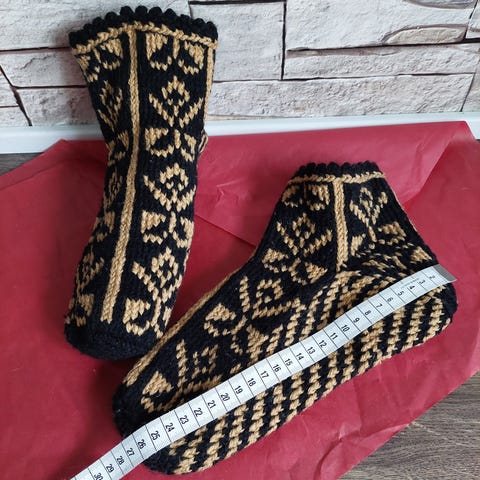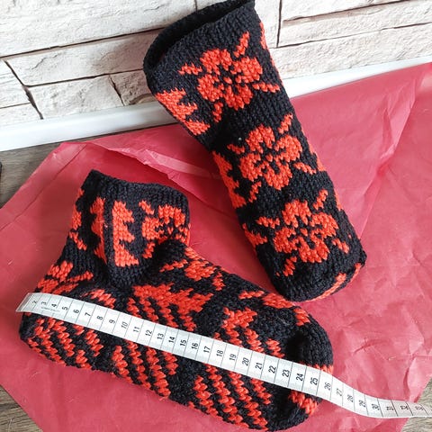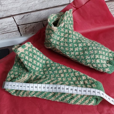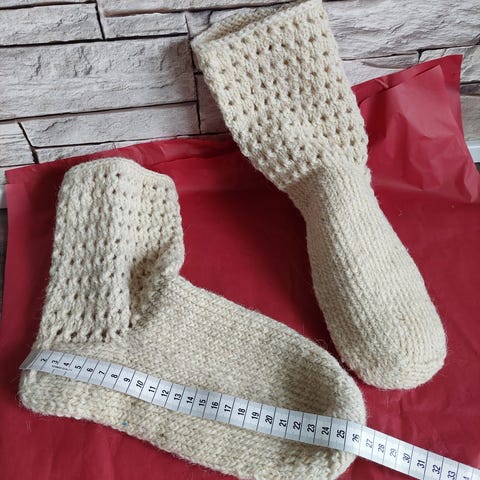 Hjemmelavet / håndlavet / hjemmestrikket tykke sokker / hjemmesko / hjemmesokker i 100 % bomuld. Fra røgfrit og dyrefrit hjem. Passer langt de fleste størrelser, da de kan udvide sig.