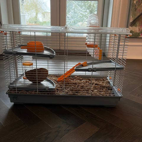 Kæledyr bur med blå bund og transparent top. Udstyret med hvid metalgitterlåge og gul låsefunktion. Inkluderer gennemsigtig tunnel med grønne beslag til tilslutning. Velegnet til små kæledyr.